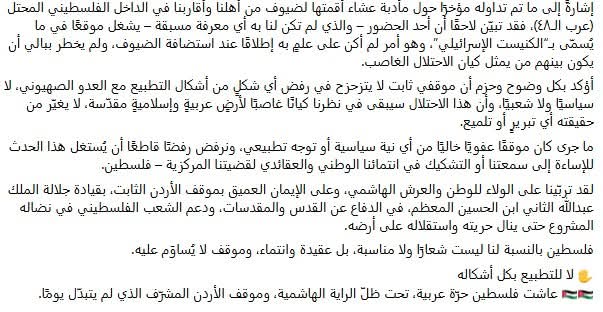 وسلطت الحادثة الضوء مجددا على حساسية ملف التطبيع الشعبي في الأردن، الذي يواجه رفضا واسعا من الشارع، في ظل الموقف الرسمي الثابت الداعم للشعب الفلسطيني وحقوقه المشروعة.
