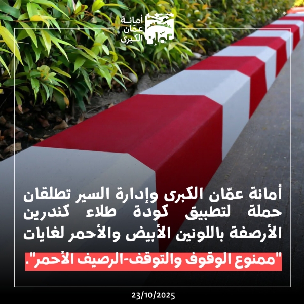 الوقائع الإخباري: تبدأ أمانة عمّان الكبرى وبالتعاون مع إدارة السير، تنفيذ حملة ميدانية شاملة تهدف إلى طلاء كندرين الأرصفة باللونين الأبيض والأحمر، ورسم خطوط حمراء على جوانب الشوارع في مواقع حيوية، إلى جانب تعزيز الشواخص المرورية لمنع الوقوف والتوقف في تلك المواقع، وذلك ضمن جهودها لتنظيم وانسيابية حركة المرور وضبط مخالفات الوقوف والتوقف.