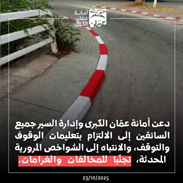 ودعت أمانة عمّان الكبرى وإدارة السير جميع السائقين إلى الالتزام بتعليمات الوقوف والتوقف، والانتباه إلى الشواخص المرورية المحدثة، تجنّبا للمخالفات والغرامات.