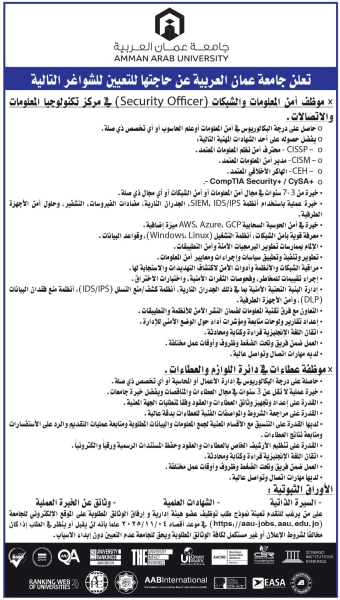 الوقائع الإخباري:تعلن جامعة عمان العربية عن حاجتها لتعيين شواغر إدارية