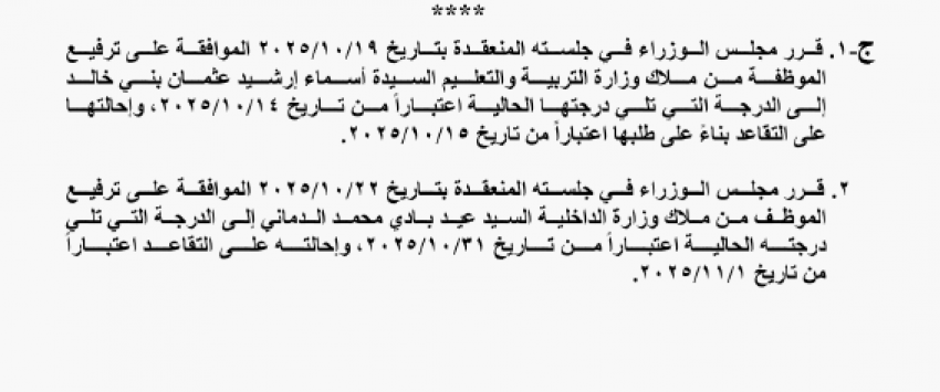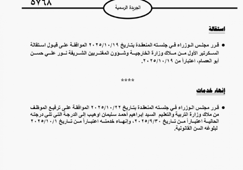 الوقائع الإخباري:صدر في عدد الجريدة الرسمية اليوم الخميس، قرارات مجلس الوزراء بإحالة عدد من موظفي الدولة إلى التقاعد، وانهاء خدمات اخرين.