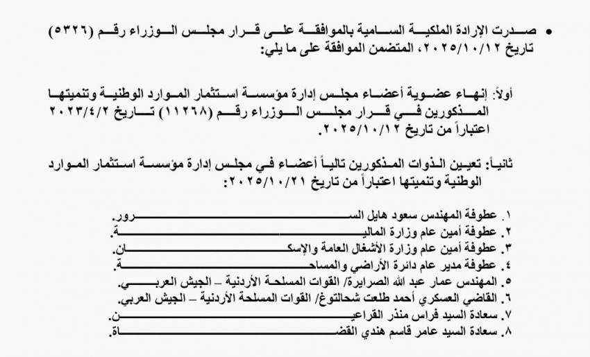 أولاً: إنهاء عضوية أعضاء مجلس إدارة مؤسسة استثمار الموارد الوطنية وتنميتها المذكورين في قرار مجلس الوزراء رقم (١١٢٦٨) تاريخ ٢٠٢٣/٤/٢ اعتباراً من تاريخ ٢٠٢٥/١٠/١٢.