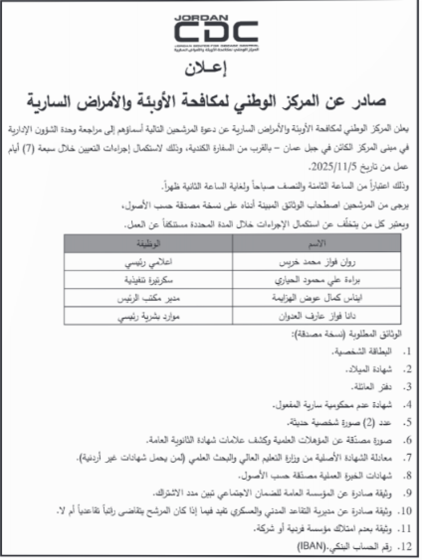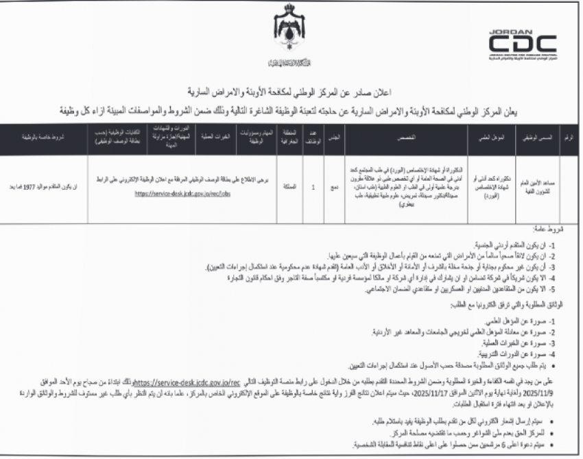 الوقائع الإخباري: أعلن المركز الوطني لمكافحة الأوبئة والأمراض السارية عن حاجته لتعبئة وظايفة شاغرة وذلك ضمن الشروط والمواصفات المبينة إزاءها.