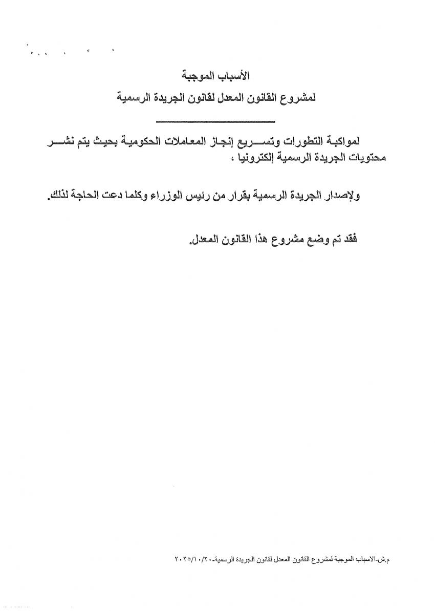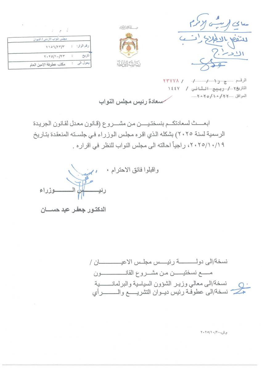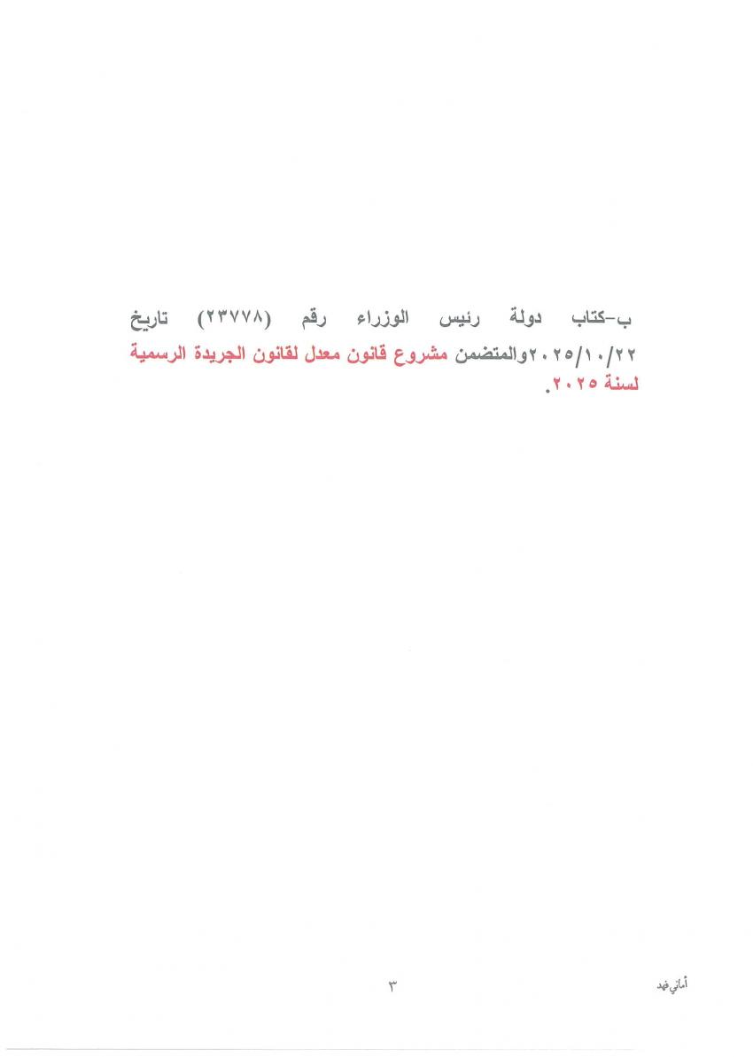 الوقائع الإخباري: أحال مجلس النواب اليوم الاثنين، مشروع القانون المعدل لقانون الجريدة الرسمية لسنة 2025 إلى لجنة التوجيه الوطني والإعلام.
