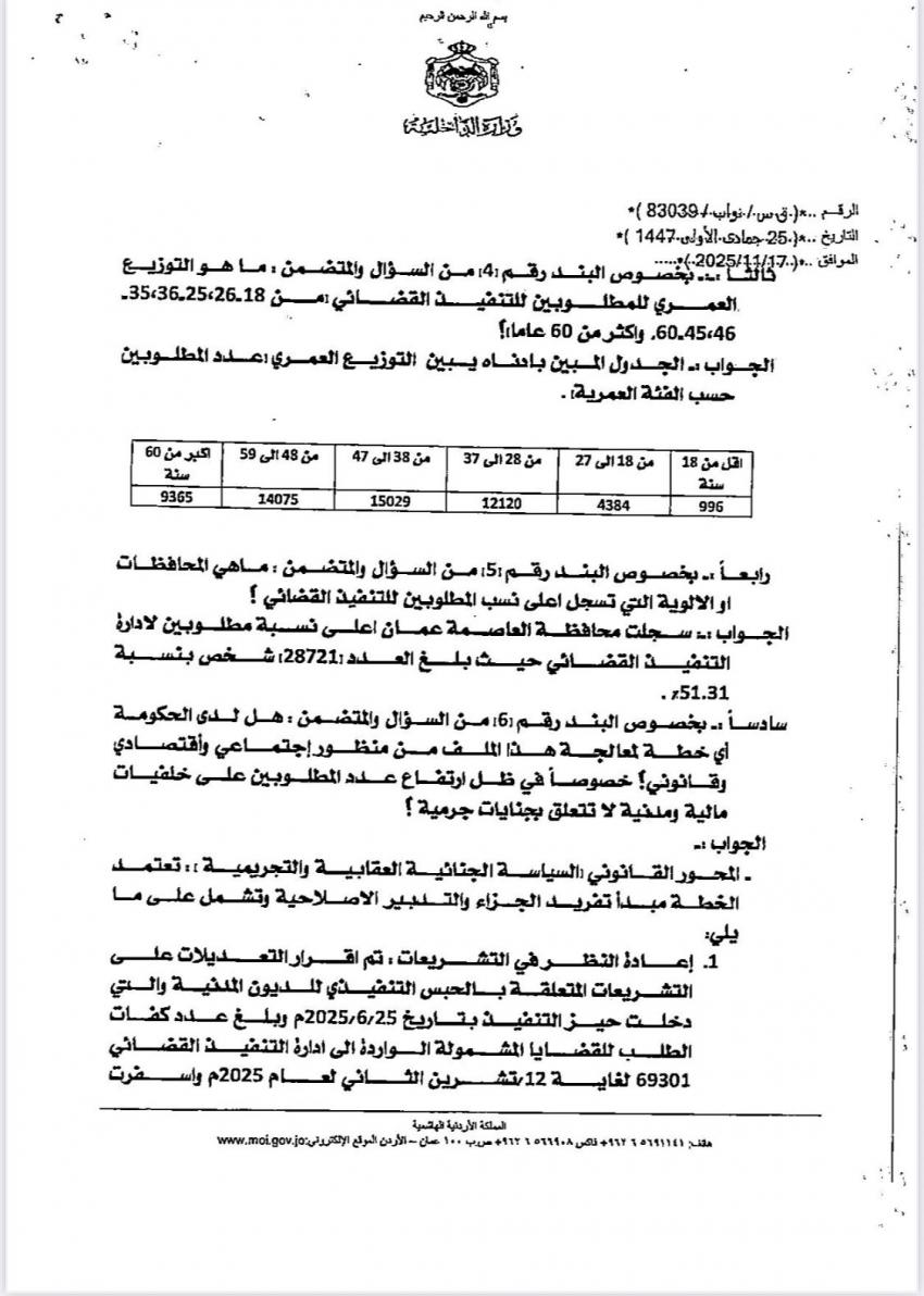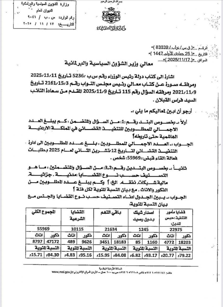 وأوضحت الوزارة في إجابتها على سؤال النائب فراس القبلان، أنّ 22975 منهم مطلوبين بقضايا "حبس مدين" فيما يصل عدد المطلوبين بقضايا "شيك بدون رصيد" 1245 مطلوبًا.