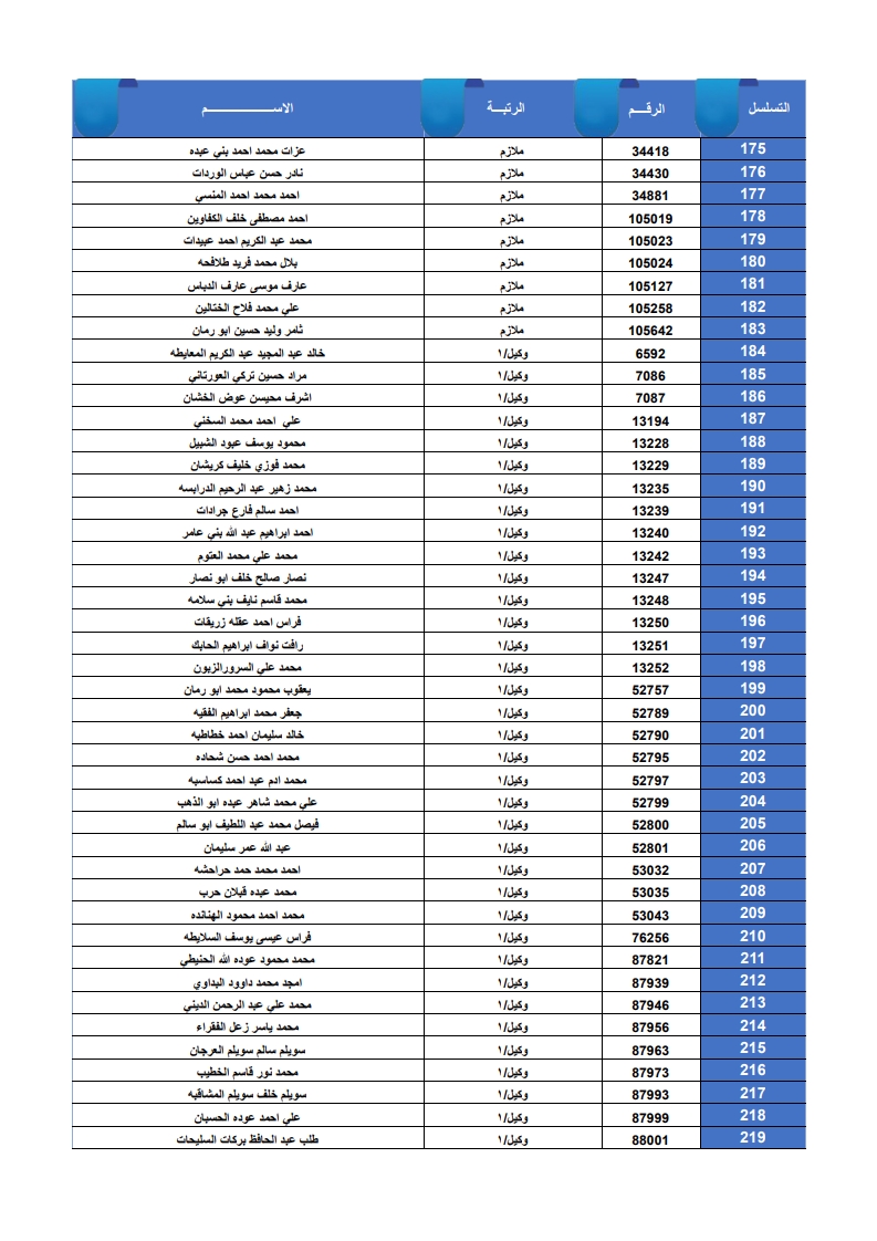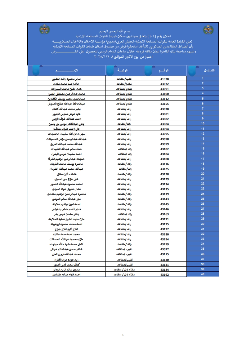الوقائع الإخباري: أعلنت مديرية مؤسسة الإسكان والأشغال العسكرية في القيادة العامة للقوات المسلحة الأردنية – الجيش العربي، عن استحقاق عدد من الضباط وضباط الصف والأفراد المدرجة أسماؤهم أدناه لقرض الإسكان العسكري المخصص للأفراد. ودعت الضباط المستفيدين من صندوق إسكان الضباط إلى مراجعة فروع بنك القاهرة عمّان، خلال ساعات الدوام الرسمي، ابتداءً من يوم الأحد الموافق 9 تشرين الثاني 2025، لاستكمال إجراءات الحصول على القرض.