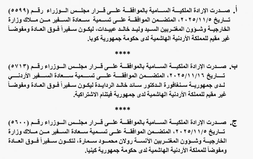 كما صدرت الإرادة الملكية السامية بالموافقة على قرار مجلس الوزراء المتضمن تسمية السفير الأردني لدى جمهورية سنغافورة الدكتور سائد خالد الردايدة ليكون سفيراً فوق العادة ومفوضاً غير مقيم للمملكة الأردنية الهاشمية لدى جمهورية فيتنام الاشتراكية.
