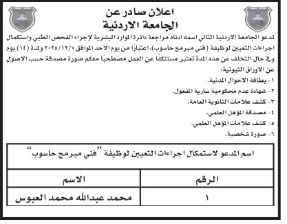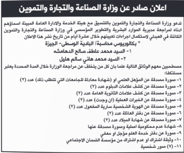 الوقائع الإخباري:دعت دوائر حكومية، اليوم الخميس، التالية أسماؤهم، لاستكمال اجراءات التعيين.