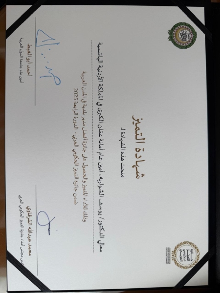 جاء ذلك خلال تسلمه جائزة التميز الحكومي العربي عن فئة "أفضل مدير بلدية في المدن العربية" ( امانة عمان الكبرى) ، في حفل أقيم في مقر جامعة الدول العربية في القاهرة لتكريم الفائزين في الدورة الرابعة للجائزة 2025، برعاية نائب رئيس دولة الإمارات العربية، رئيس مجلس الوزراء، حاكم امارة دبي صاحب السمو الشيخ محمد بن راشد آل مكتوم، و حضور الامين العام لجامعة الدول العربية احمد ابو الغيط.