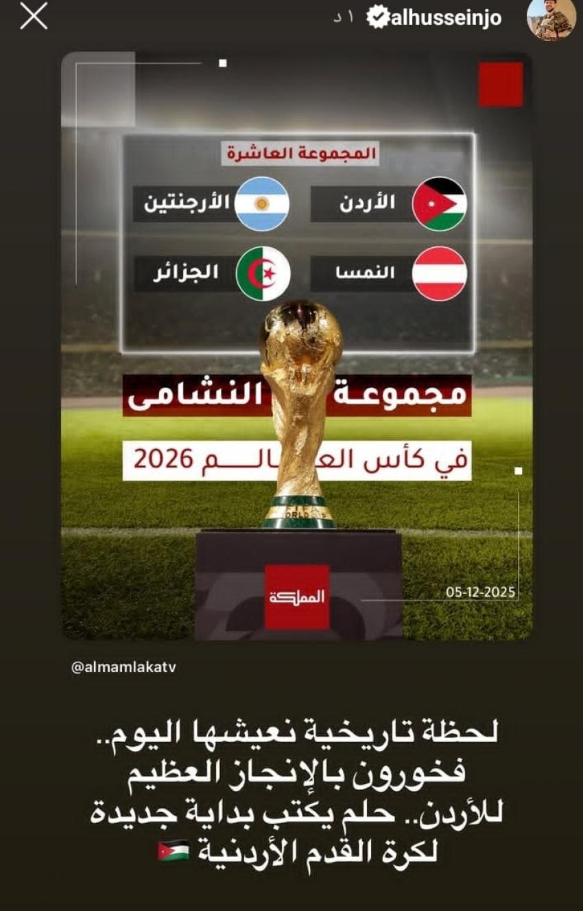 وأضاف سموه في منشور عبر الأنستغرام:" فخورون بالإنجاز العظيم للأردن.. حلم يصنع بداية جديدة لكرة القدم الأردنية ".