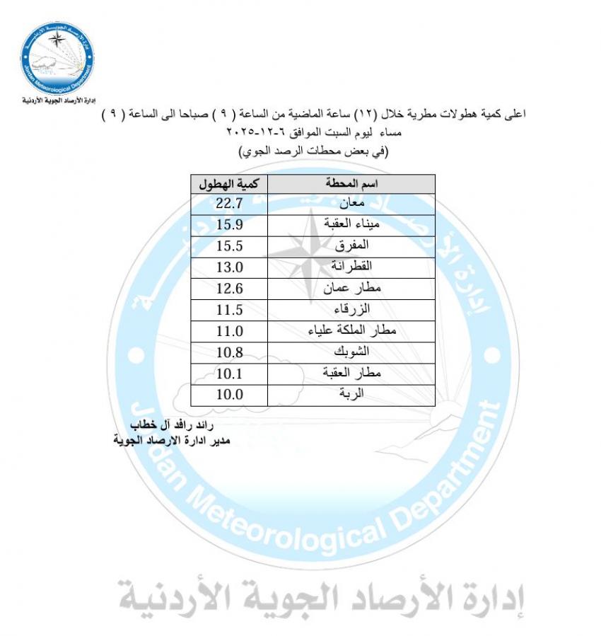 ووفق آل خطاب كانت محافظة معان الأعلى بـ 22.7 ملم، تلاها ميناء العقبة بـ 15.9 ملم، ثم المفرق 15.5 ملم، والقطرانة 13.0 ملم، ومطار عمان 12.6 ملم، ثم الزرقاء 11.5 ملم، ومطار الملكة علياء 11.0 ملم، ثم الشوبك 10.8 ملم، ومطار العقبة 10.1 ملم، والربة 10.0 ملم.