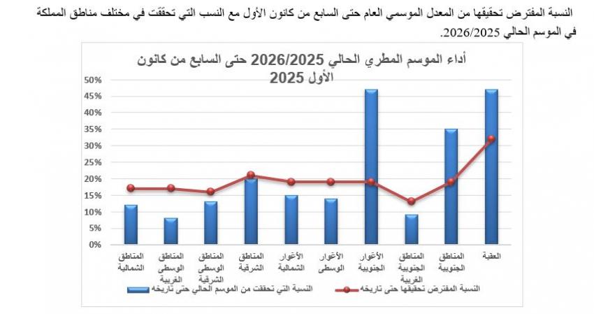 وبالاطلاع على أداء الموسم المطري الحالي حتى تاريخ اليوم فإن الأداء المطري هو اعلى من المفترض في المناطق الجنوبية بما فيها الاغوار الجنوبية والعقبة والذي تراوح ما بين (148%-246%)، فيما كان الأداء المطري جيداً وحول معدله في باقي مناطق المملكة باستثناء المناطق الوسطى الغربية والتي لا يزال فيها الأداء المطري ضعيف وبنسبة 48%.