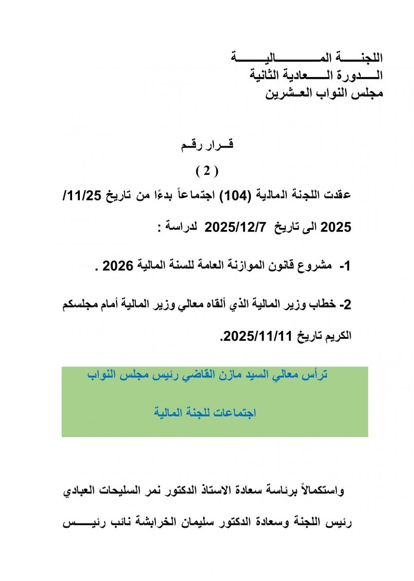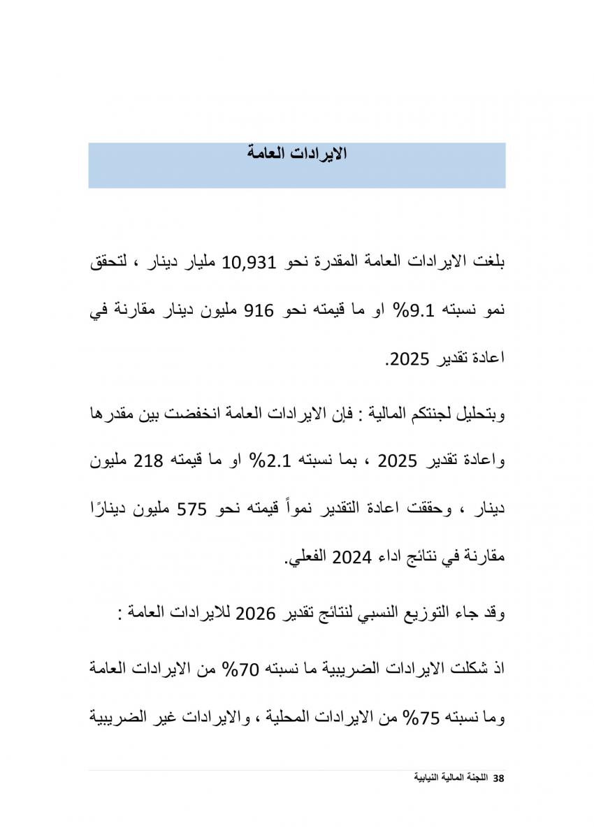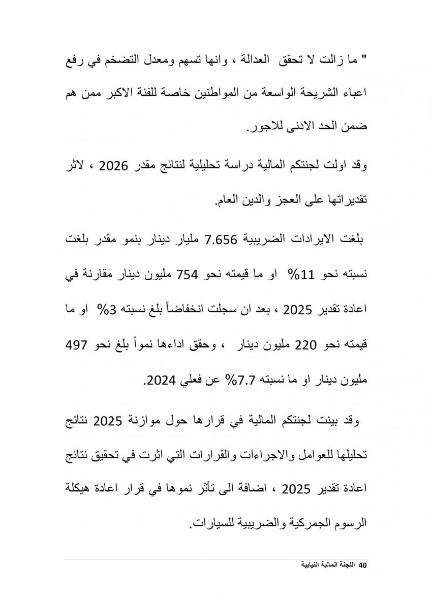 الوقائع الإخباري:- تلا مقرر اللجنة المالية في مجلس النواب النائب محمد البستنجي خلال جلسة اليوم الاثنين، نص قرار اللجنة بشأن مشروع قانون الموازنة العامة لسنة 2026، تمهيدا للشروع بمناقشة القانون تحت القبة.