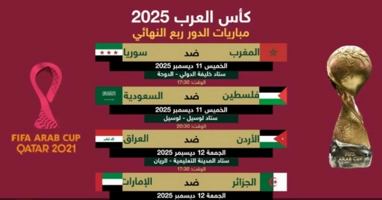 وتوضح المواجهات المقررة في الدور ربع النهائي أن المباراة الأولى ستجمع بين المغرب وسوريا، فيما يلتقي فلسطين مع السعودية يوم الخميس 11 ديسمبر، على أن تتواجه منتخبات الأردن والعراق، ثم الجزائر والإمارات في اليوم التالي.