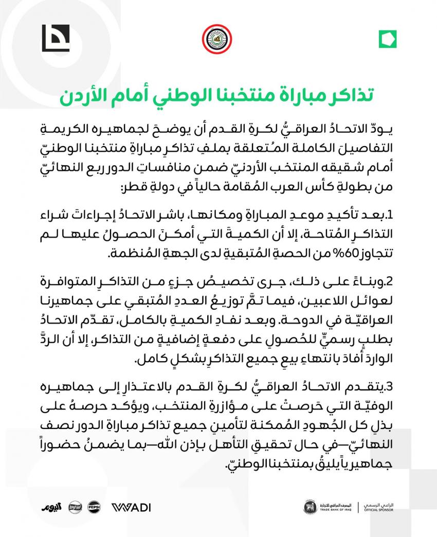 وأشار الاتحاد إلى أنه بعد تحديد موعد ومكان المباراة، باشر في شراء التذاكر المتاحة، لكن الكمية التي حصل عليها لم تتجاوز 60% من الحصة المتبقية لدى الجهة المنظمة. جرى تخصيص جزء من التذاكر لعوائل اللاعبين، بينما تم توزيع الباقي على جماهير العراق في الدوحة، وبعد نفاد الكمية بالكامل، طلب الاتحاد الحصول على دفعة إضافية، لكن الرد جاء بانتهاء بيع جميع التذاكر.