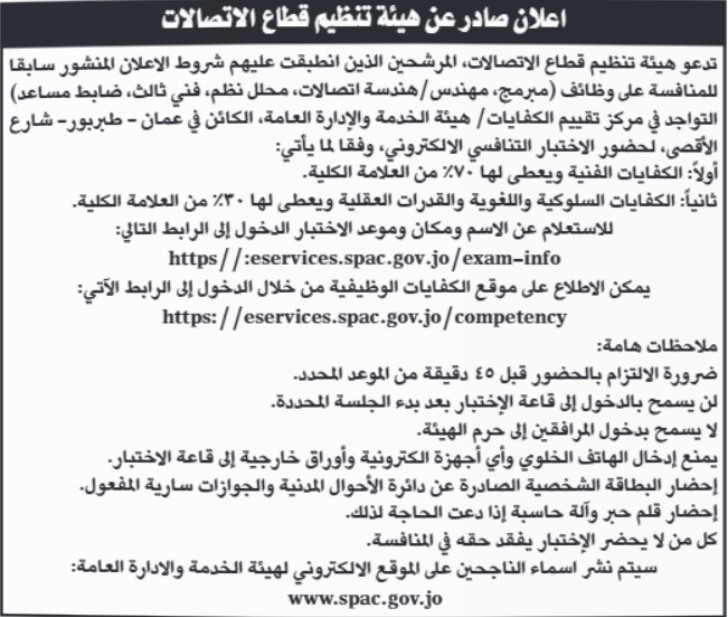 الوقائع الإخباري :دعت هيئة تنظيم قطاع الاتصالات، اليوم الاحد المرشحين الذين انطبقت عليهم شروط الاعلان المنشور سابقا للامتحان التنافسي.