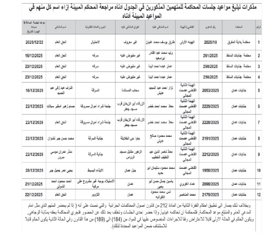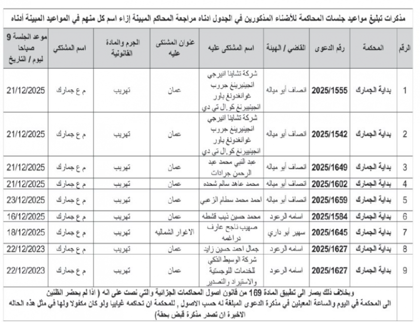 الوقائع الإخباري :صدرت اليوم الاثنين، مذكرات تبليغ بمواعيد جلسات محاكمة لمشتكى عليهم في المحاكم النظامية.