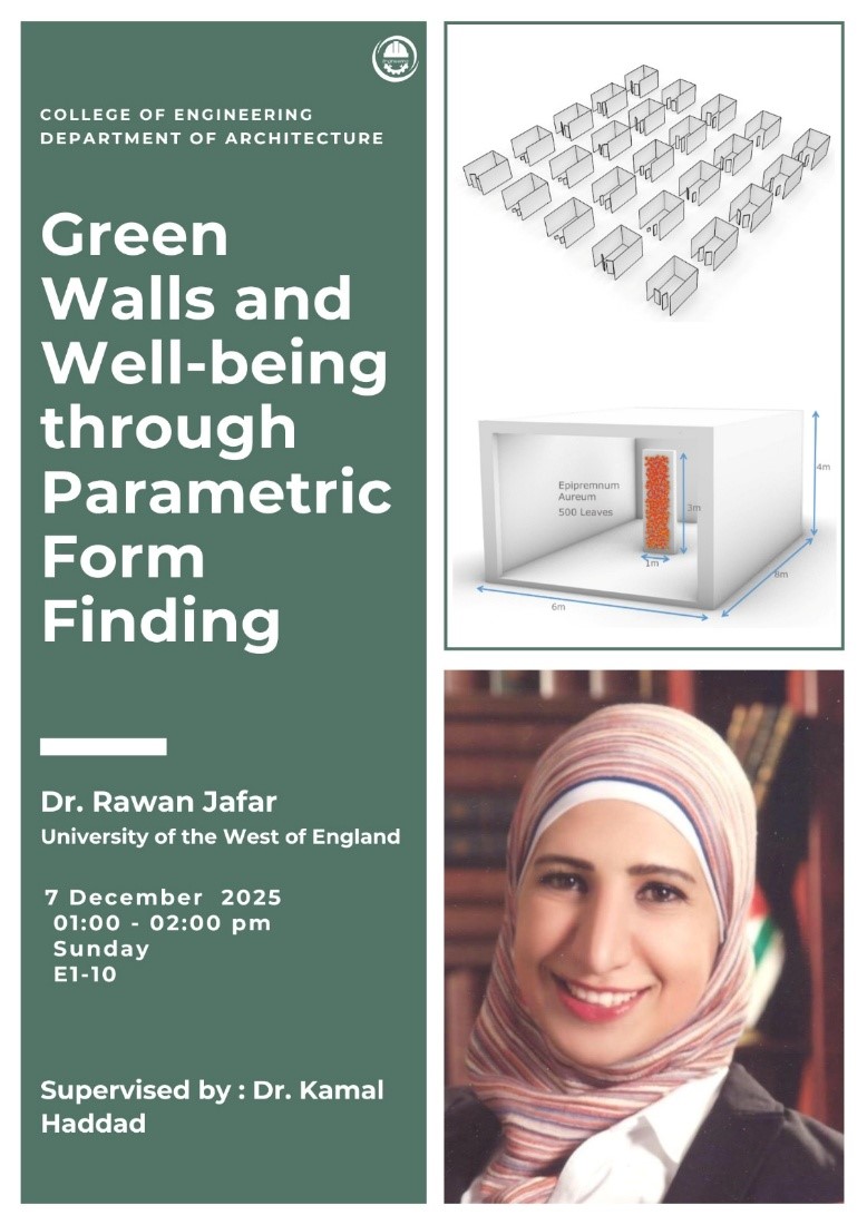 الوقائع الإخباري: استمراراً لحرص كلية الهندسة في جامعة عمان العربية على دمج الجوانب النظرية بالجانب العملي والتطبيقي وتعزيز المعرفة التطبيقية لدى طلبة قسم هندسة العمارة وتطوير مهاراتهم في مجالات التصميم المستدام، وتنفيذاً لتوجيهات الأستاذ الدكتور محمد الوديان رئيس الجامعة، وبمتابعة مستمرة من الدكتور أنو العساف عميد كلية الهندسة في الجامعة، عقد قسم هندسة العمارة محاضرة بعنوان: "الجدران الخضراء والصحة عبر التصميم البارامتري"، قدمتها الدكتورة روان جعفر من جامعة غرب إنجلترا (UWE) ، بهدف تعزيز المعرفة التطبيقية لدى طلبة العمارة وتطوير مهاراتهم في مجالات التصميم المستدام.