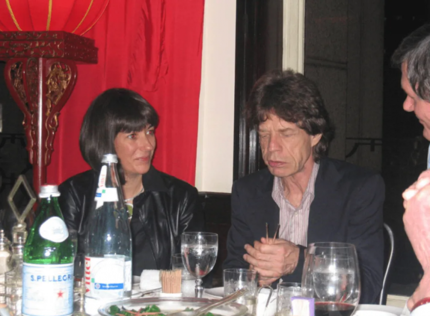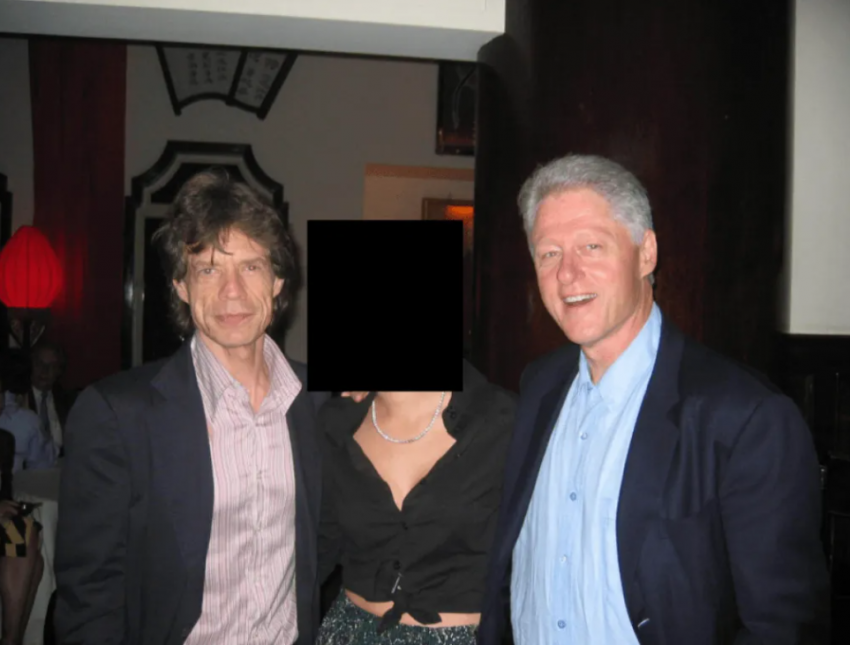 وفي صورة أخرى غير مؤرخة من ملفات وزارة العدل، ظهر جيفري إبستين، وشريكته غيسلين ماكسويل، والرئيس الأمريكي الأسبق بيل كلينتون، ومغني فرقة رولينغ ستونز ميك جاغر، وهم يتشاركون عشاء واحدا. ويُرى جاغر وكلينتون وهما يقتربان من امرأة جرى طمس وجهها في إحدى الصور.