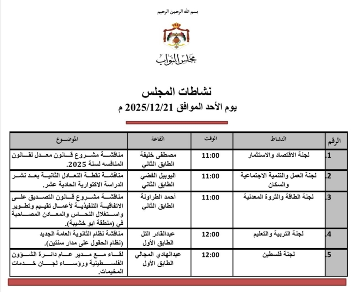 وتناقش لجنة العمل والتنمية الاجتماعية والسكان، نقطة التعادل الثانية من الدراسة، فيما تناقش لجنة الاقتصاد والاستثمار مشروع قانون معدل لقانون المنافسة لسنة 2025.