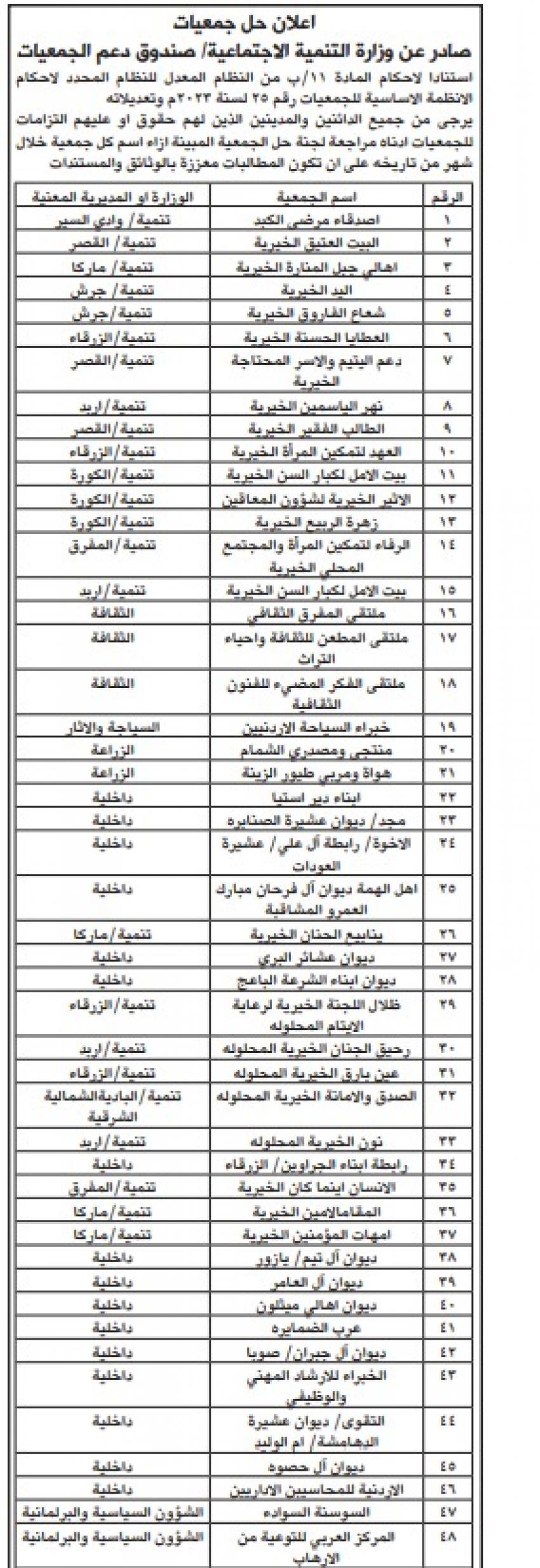 الوقائع الإخباري: أعلنت وزارة التنمية الاجتماعية، من خلال صندوق دعم الجمعيات، عن حلّ 66 جمعية، وذلك استنادًا إلى أحكام المادة (11/ب) من النظام المعدّل للنظام المحدِّد لأحكام الأنظمة الأساسية للجمعيات رقم (25) لسنة 2023 وتعديلاته.
