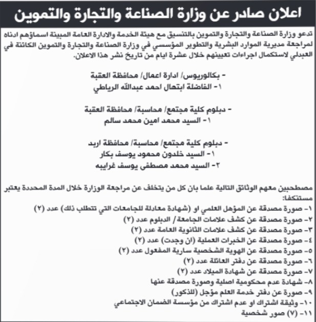 الوقائع الإخباري :دعت دوائر حكومية، اليوم الثلاثاء، التالية أسماؤهم، لاستكمال اجراءات التعيين.