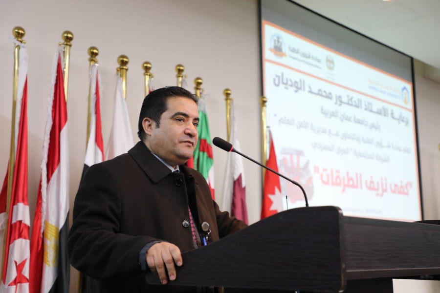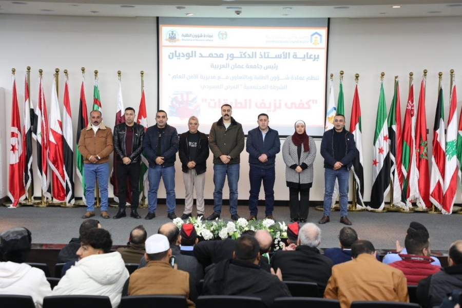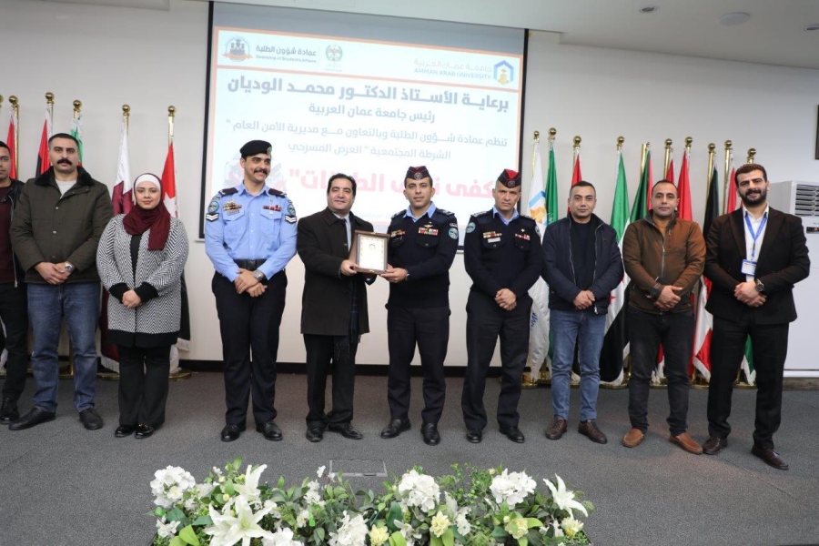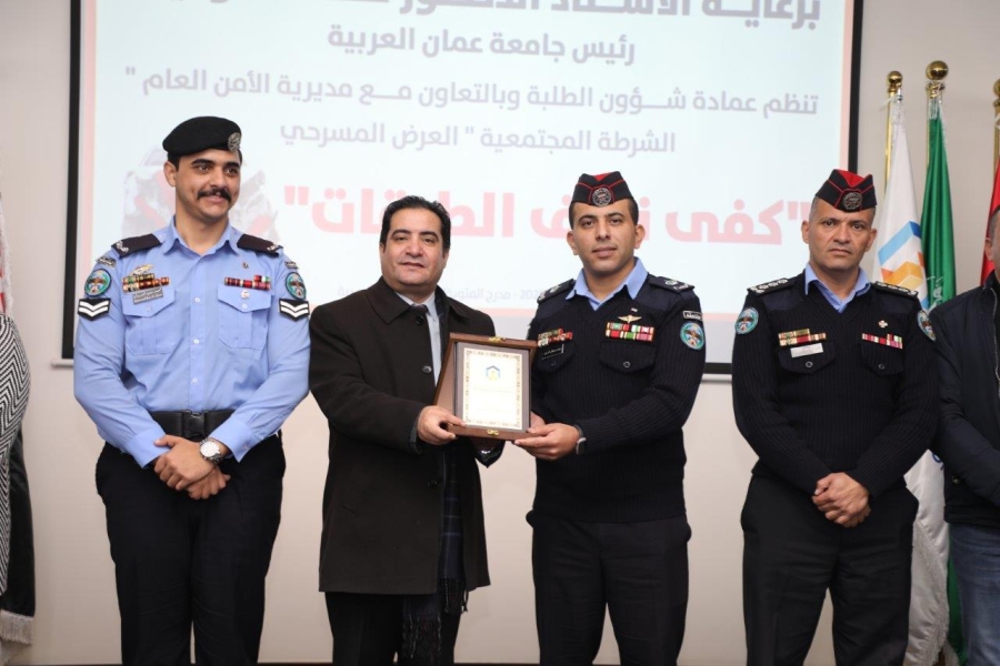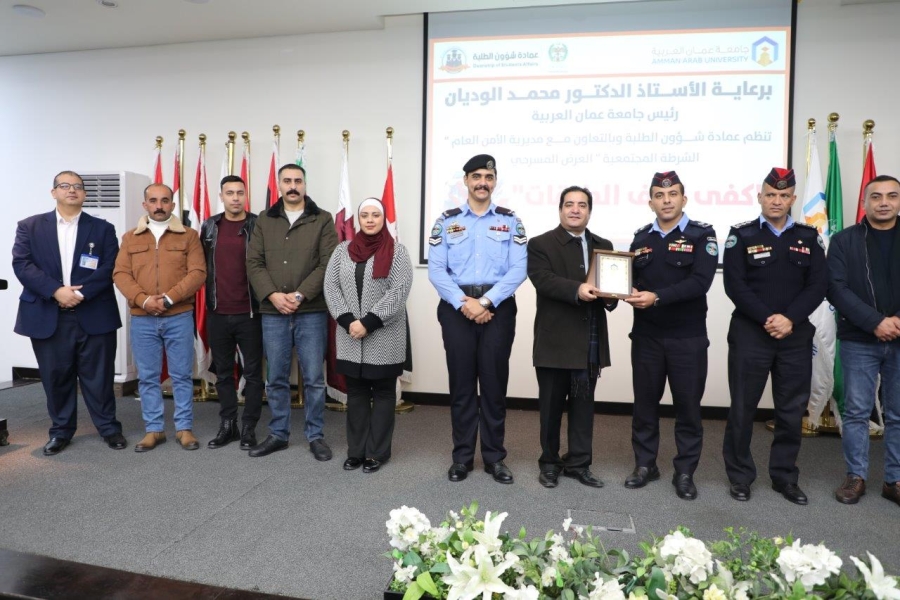 الوقائع الإخباري : تحت رعاية الأستاذ الدكتور محمد الوديان رئيس جامعة عمان العربية وانطلاقاً من مسؤولية الجامعة المجتمعية وحرصها على ترسيخ ثقافة السلامة المرورية وتعزيز الوعي بمخاطر الحوادث، نظمت عمادة شؤون الطلبة وبالتعاون مع مديرية الأمن العام/ الشرطة المجتمعية، عرضاً مسرحياً بعنوان: " كفى نزيف الطرقات" والذي قدمه الفريق المسرحي التابع لإدارة العلاقات العامة في الشرطة المجتمعية، وبحضور الدكتور محمد بن طريف عميد شؤون الطلبة مندوباً عن رئيس الجامعة، والرائد محمد بيك القرعان رئيس قسم الشرطة المجتمعية في محافظة البلقاء، وعدد من أعضاء الهيئتين التدريسية والإدارية وطلبة الجامعة.