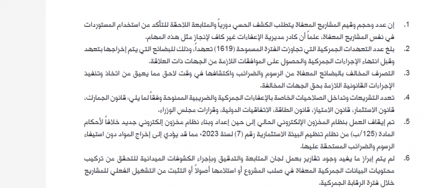 .5 تم إيقاف العمل بنظام المخزون الإلكتروني الحالي إلى حين إعداد وبناء نظام مخزون إلكتروني جديد خلافاً لأحكام المادة (125) / ب) من نظام تنظيم البيئة الاستثمارية رقم (7) لسنة 2023 ، مما قد يؤدي إلى إخراج المواد دون استيفاء الرسوم والضرائب المستحقة عليها.