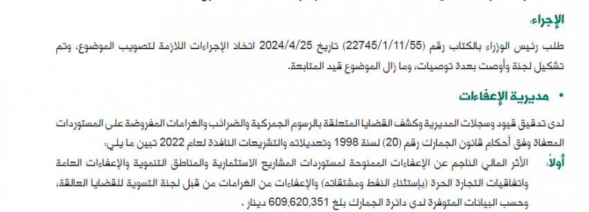 وقال التقرير أنّ الكشوفات الميدانية التي يتم إجراؤها من قبل إعفاءات المستثمرين في المديرية على بعض المشاريع الاستثمارية الحاصلة على إعفاءات جمركية للتأكد من استخدام المستوردات المعفاة في غايتها المحددة، تبين ارتكاب العديد من الجهات والشركات لمخالفات جوهرية لقرارات (111) قضية لغايات احتساب وفرض الرسوم والضرائب والغرامات وفق أحكام الجمارك المشار إليه 11,104,221 دينار، ولدى المراجعة تبين التالي: