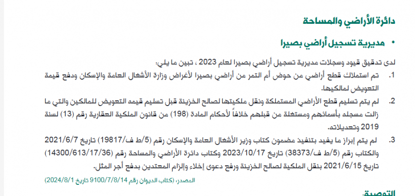 واختتم التقرير بالتوصية باتخاذ الإجراءات اللازمة لتنفيذ تلك الكتب والالتزام بقانون الملكية العقارية رقم 13 لسنة 2019 وتعديلاته مستقبلاً عند الاستملاكات لأغراض المشاريع الحكومية وفق الأصول.