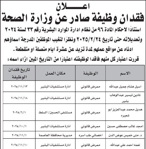 الوقائع الإخباري : قررت وزارة الصحة اعتبار الموظفين الواردة أسماؤهم أدناه فاقدين لوظائفهم، نتيجة تغيبهم عن أماكن عملهم لمدة تجاوزت عشرة أيام سواء كانت متصلة أو متفرقة، وذلك استنادًا لأحكام المادة (96) من نظام إدارة الموارد البشرية رقم (33) لسنة 2024 وتعديلاته، وحتى تاريخ 24/2/2025.