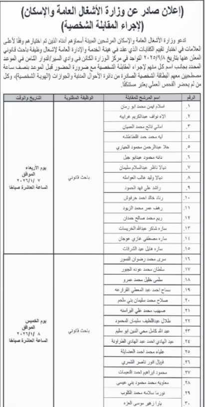 الوقائع الإخباري : دعت وزارة الأشغال العامة والاسكان اليوم الاثنين ، التالية أسماؤهم لاجراء المقابلة الشخصية.