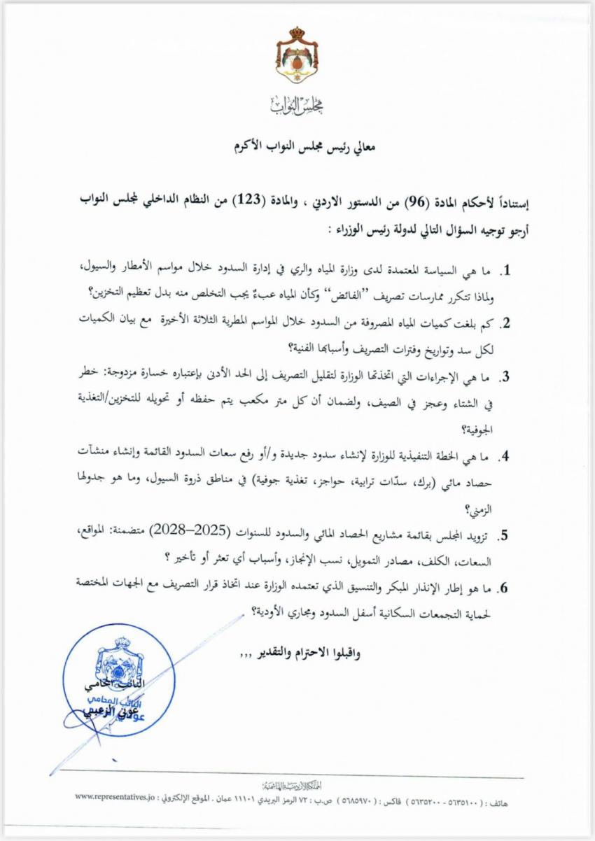 الوقائع الإخباري:وجه النائب عوني الزعبي سؤالاً نيابياً إلى رئيس الوزراء، مطالباً بتوضيح سياسة وزارة المياه والري في إدارة السدود خلال مواسم الأمطار والسيول.