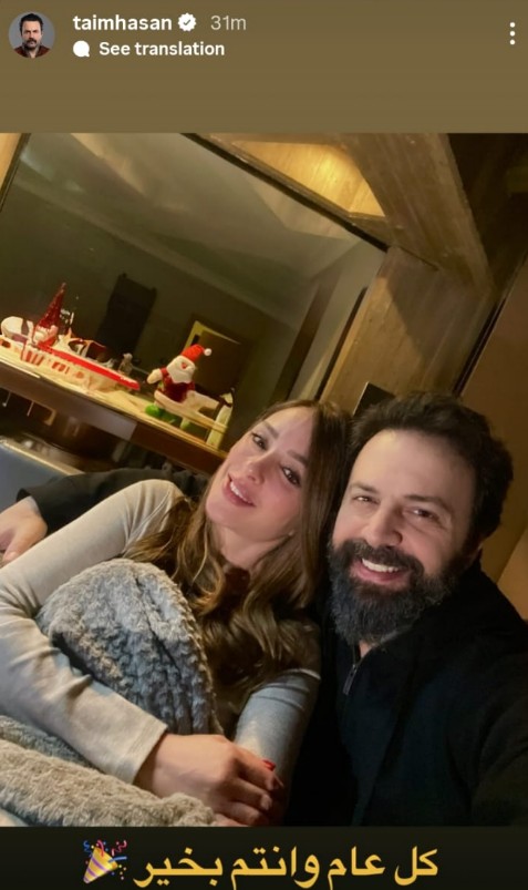 وأطل تيم في الصورة برفقة زوجته الإعلامية المصرية وفاء الكيلاني وهما يحتفلان برومانسية برأس السنة الجديدة.