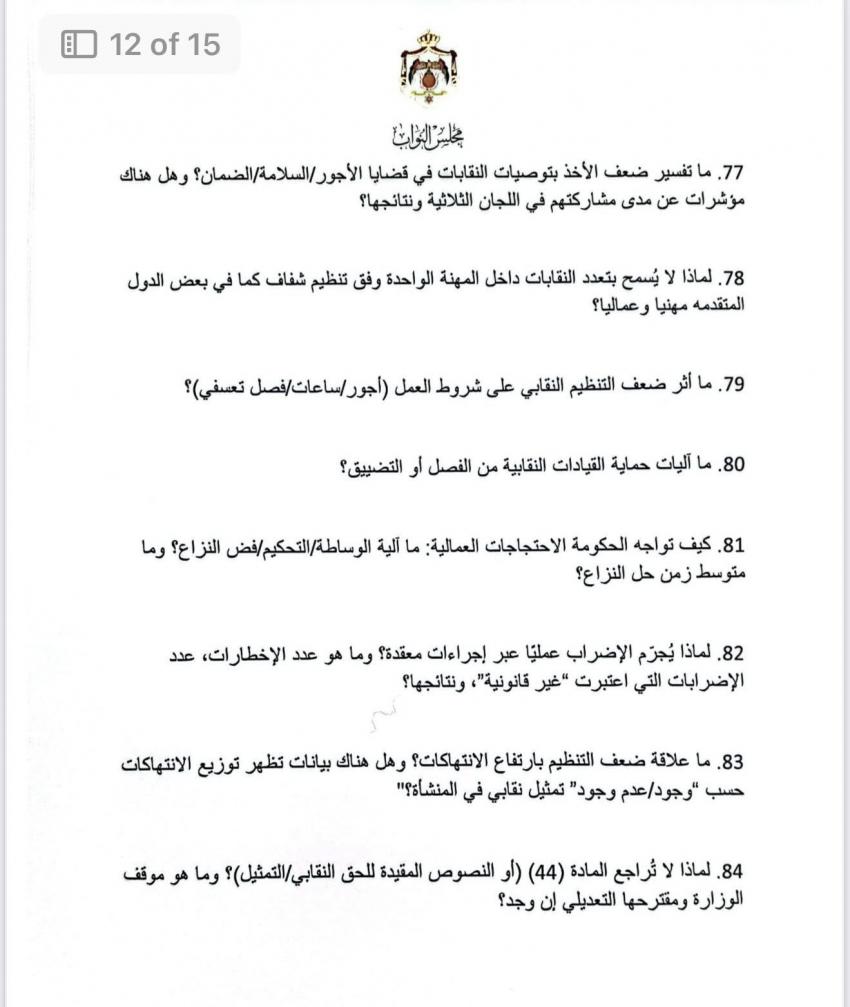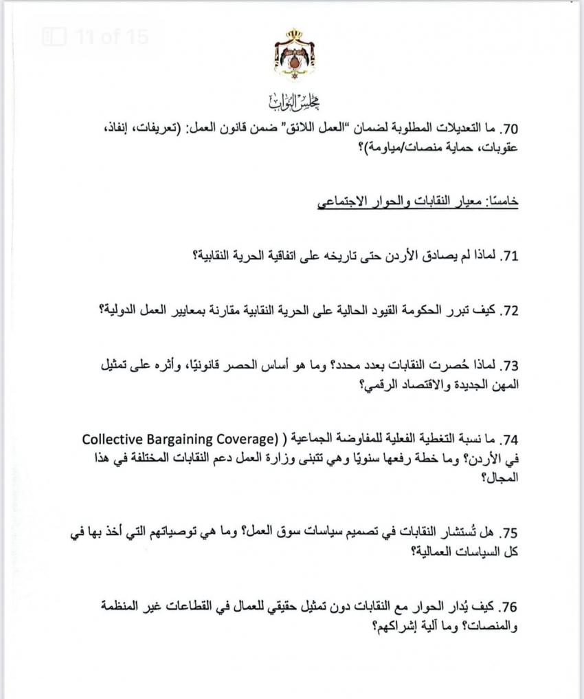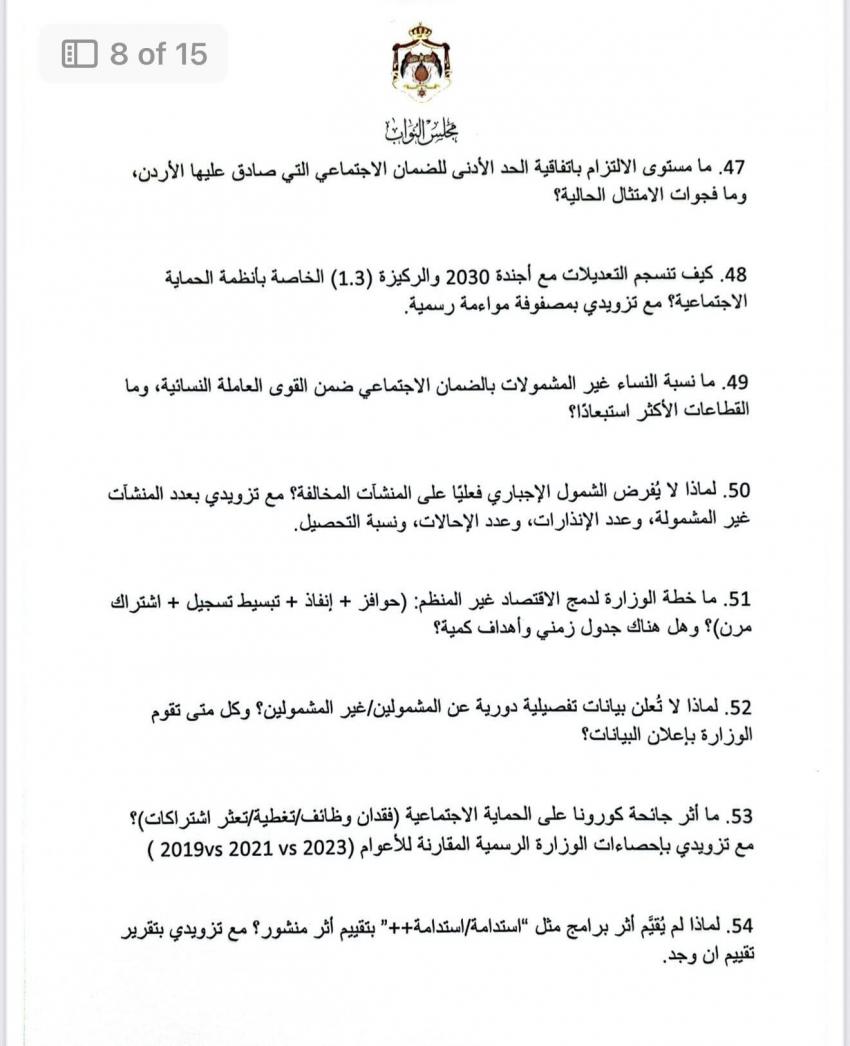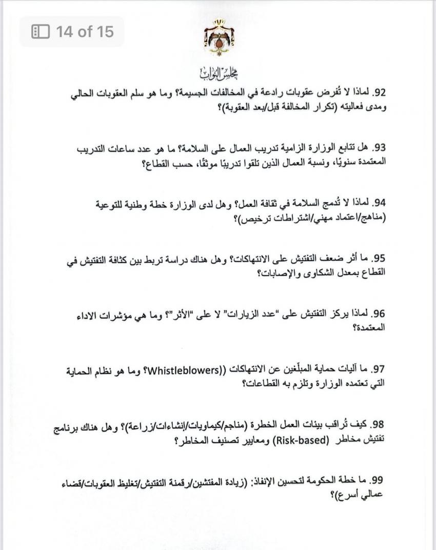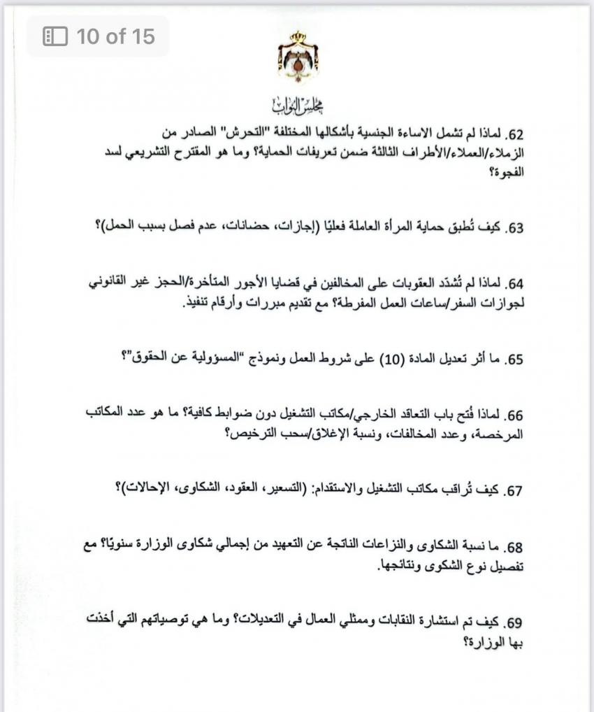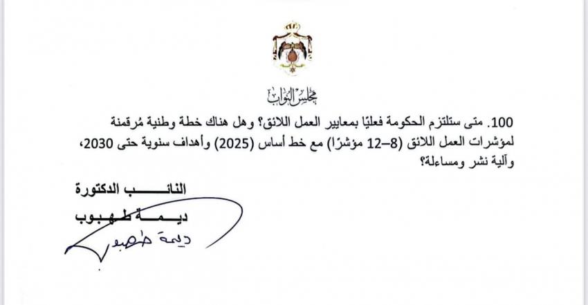 الوقائع الإخباري: في أطول استجواب بتاريخ مجلس النواب الأردني، وجهت النائب ديمة طهبوب 100 سؤال استجوابي إلى وزير العمل حول تطبيق معايير العمل اللائق.