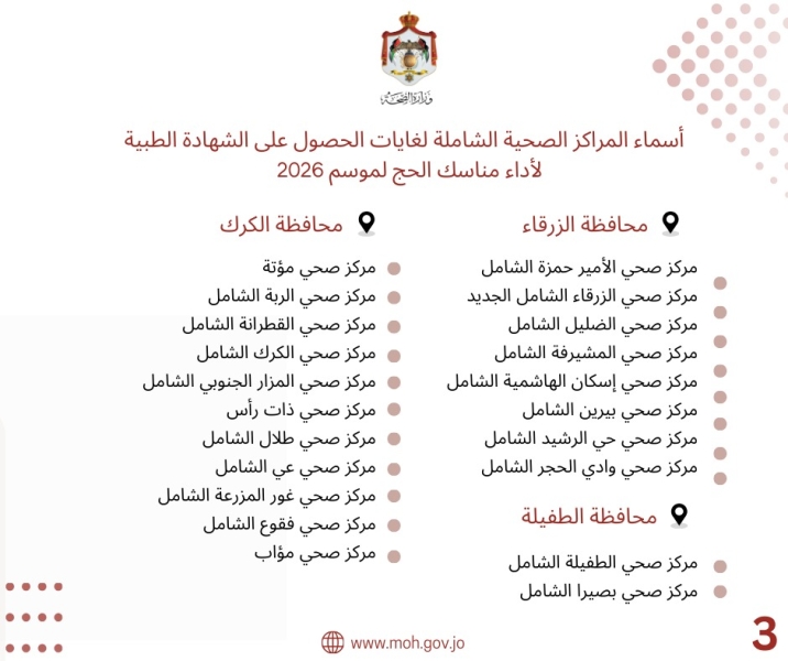 الوقائع الإخباري :أعلنت وزارة الصحة أسماء المراكز الصحية الشاملة المعتمدة لاستخراج الشهادات الطبية اللازمة لأداء مناسك الحج لموسم 2026. وتشمل المراكز قائمة مختارة تقدم خدمات الفحص الطبي والتقييم الصحي لضمان جاهزية الحجاج لأداء المناسك بأمان، وفق الإجراءات الصحية المعتمدة من الوزارة.