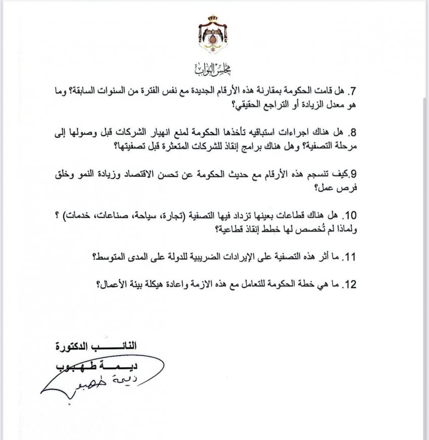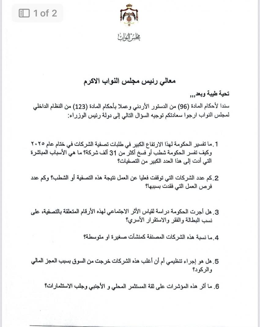 الوقائع الإخباري : وجهت النائب الدكتورة ديمة طهبوب، سؤالاً نيابياً للحكومة عبر رئاسة مجلس النواب، بشأن الارتفاع الكبير في طلبات تصفية وشطب الشركات في الأردن خلال عام 2025، والتي تجاوزت 31 ألف شركة.