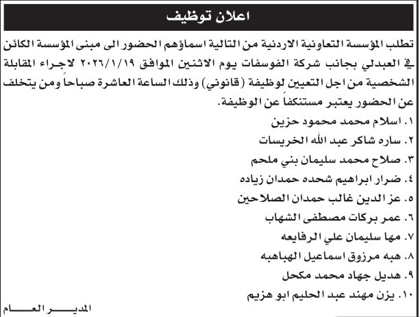 الوقائع الإخباري :دعت المؤسسة التعاونية الاردنية اليوم الاثنين، التالية أسماؤهم لاجراء المقابلة الشخصية.