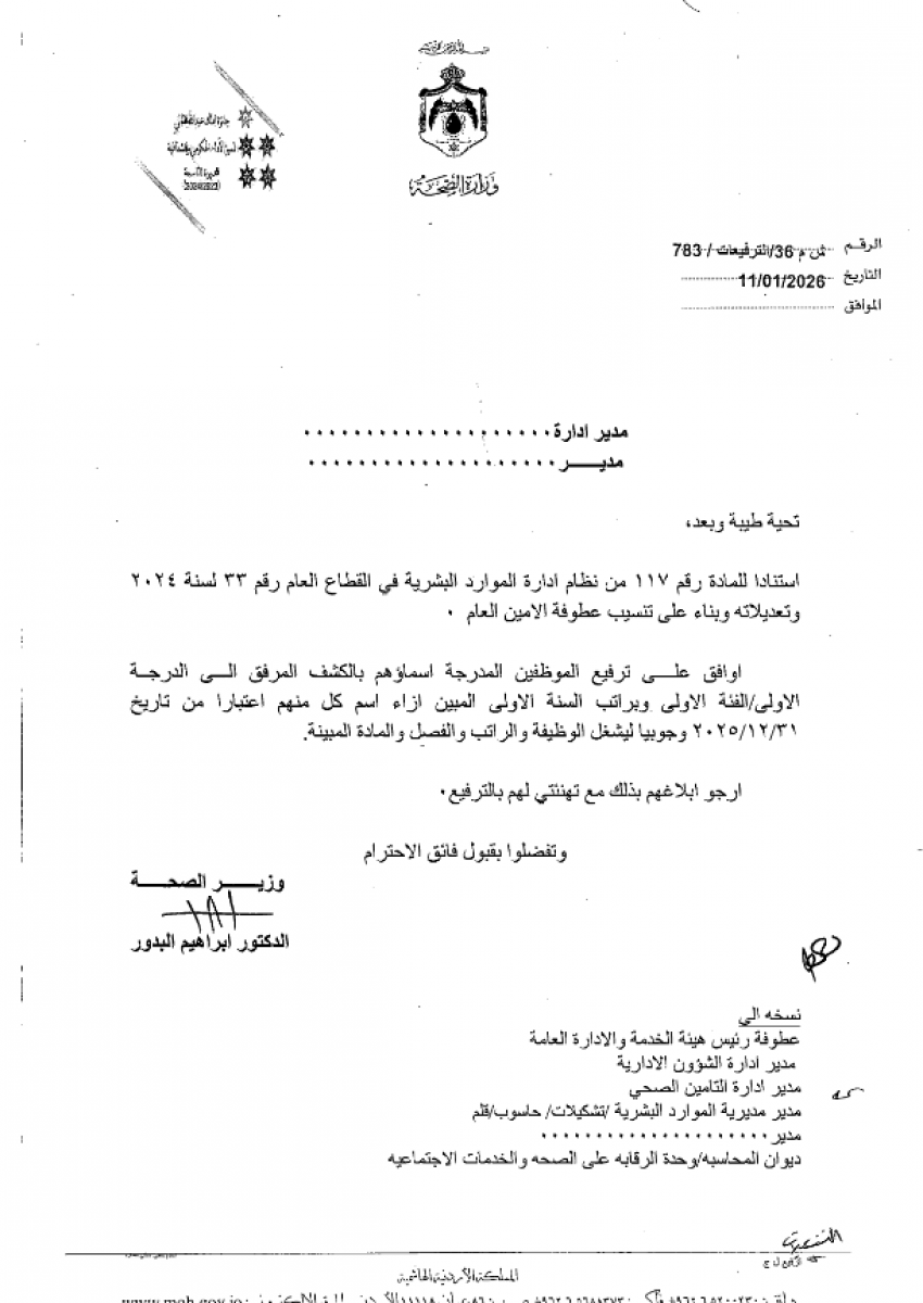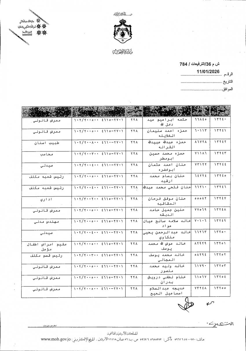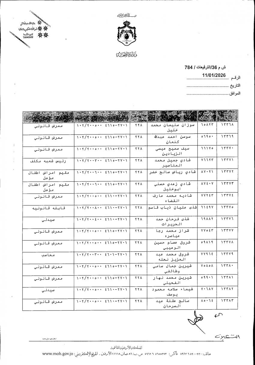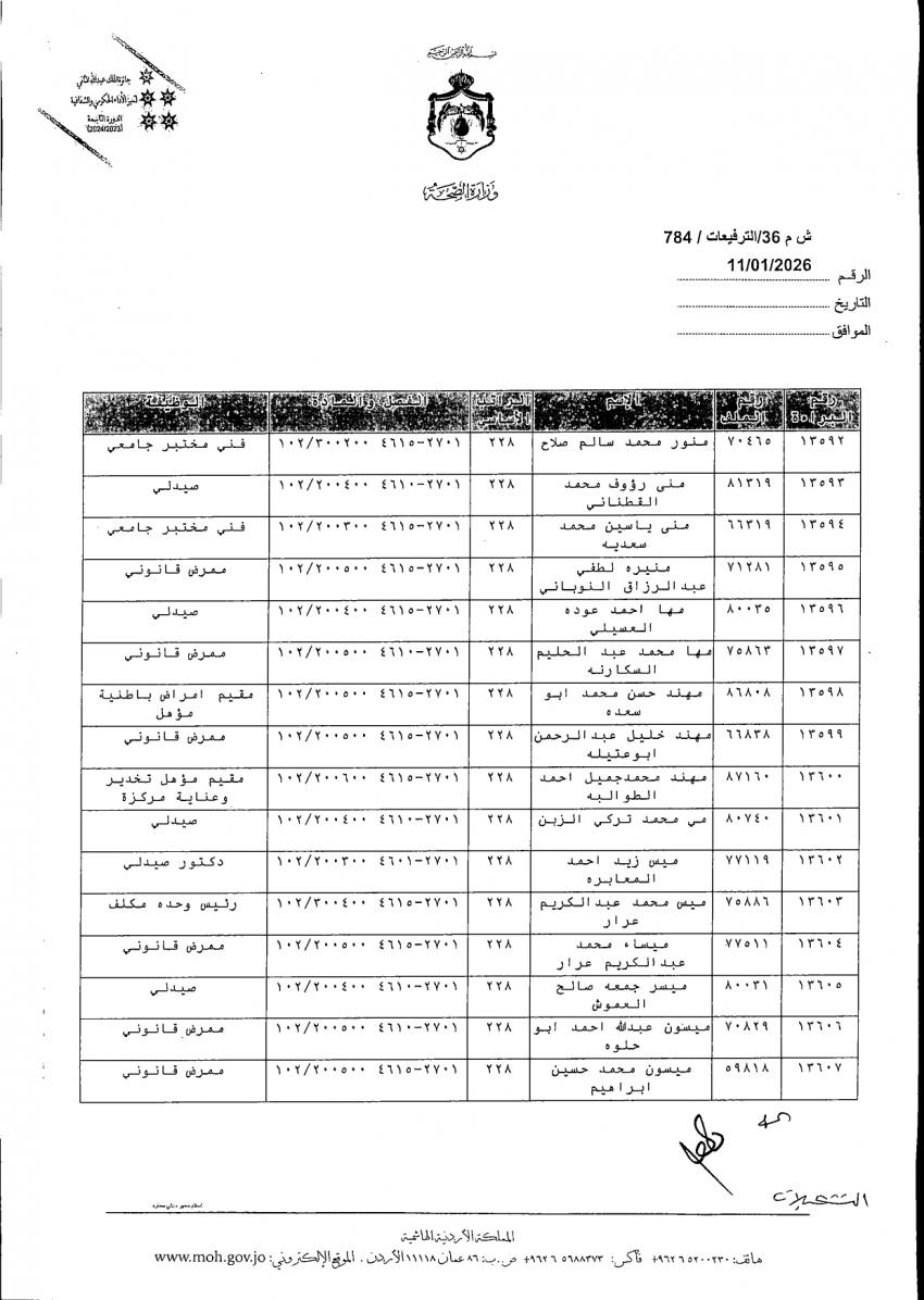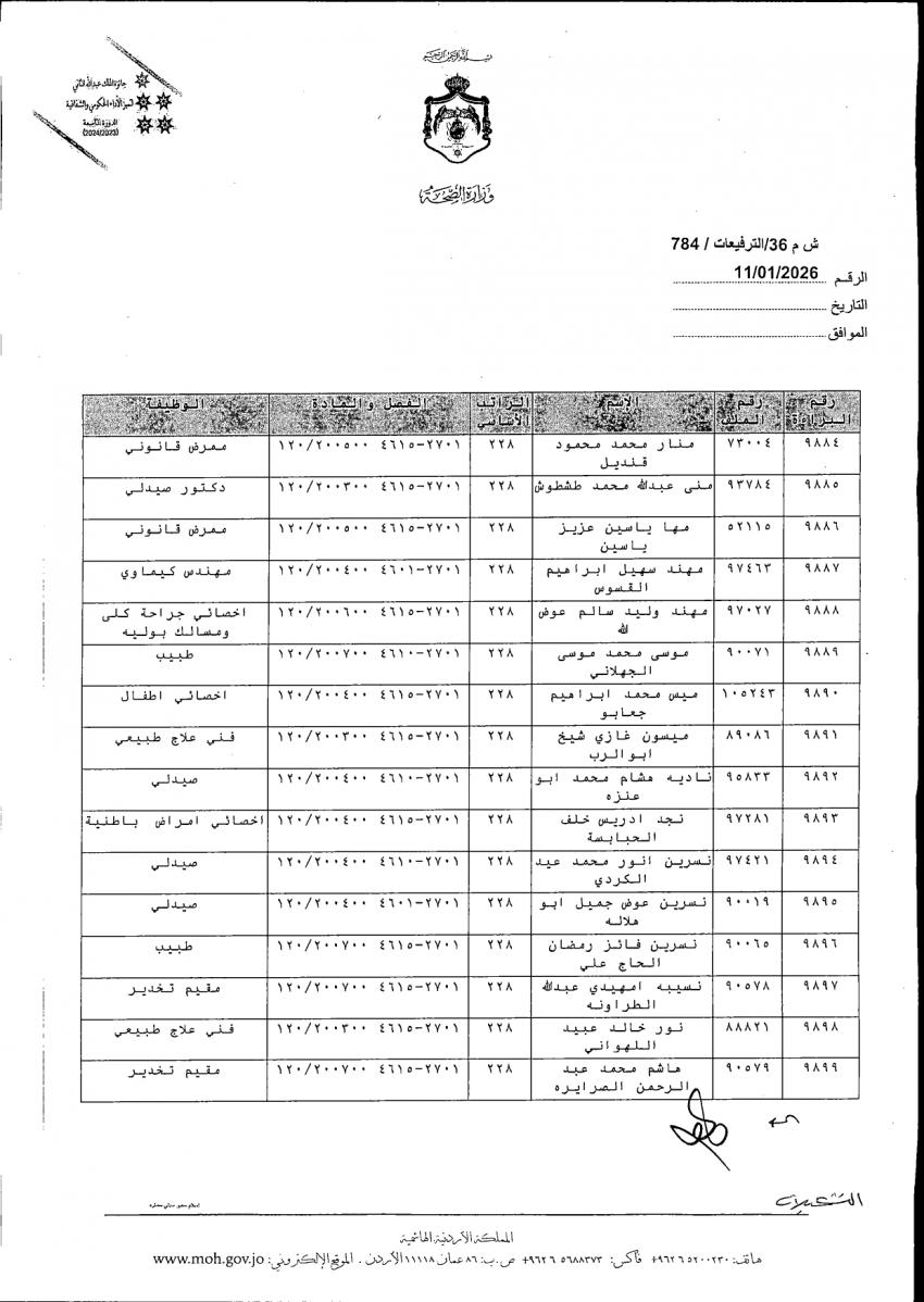 الوقائع الإخباري :وافق وزير الصحة الدكتور إبراهيم البدور على ترفيع الموظفين المدرجة أسماؤهم أدناه، وذلك بالترفيع الوظيفي من الفئتين الوظيفيتين الأولى والثانية إلى مختلف الدرجات.