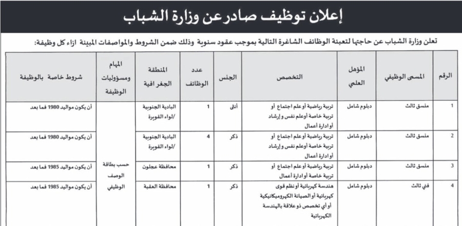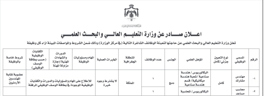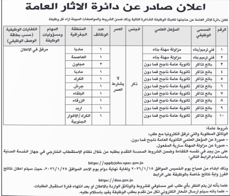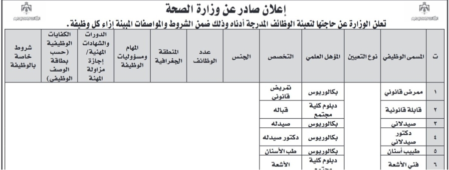 الوقائع الإخباري :اعلنت دوائر حكومية، اليوم الثلاثاء عن حاجتها لتعبئة وظائف شاغرة.