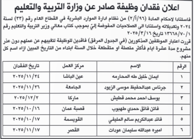 الوقائع الإخباري :أصدرت وزارة التربية والتعليم قرارًا، استنادًا إلى أحكام المادة (96/أ/2) من نظام الخدمة المدنية لسنة 2024، يقضي باعتبار الموظفين المذكورين في الجدول المرفق أدناه فاقدين لوظائفهم.