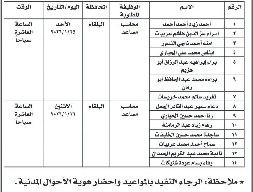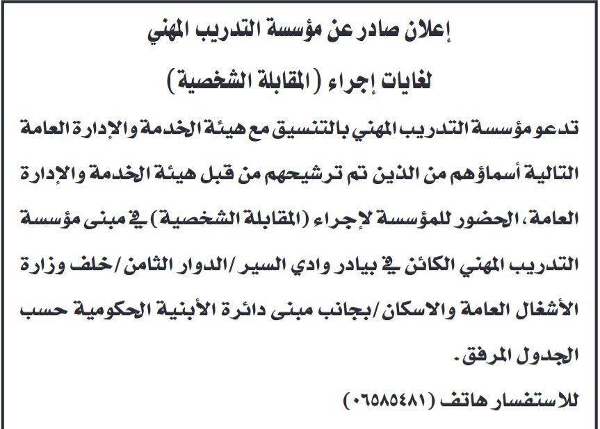الوقائع الإخباري : دعت مؤسسة التدريب المهني اليوم الاربعاء التالية أسماؤهم لإجراء المقابلة الشخصية.