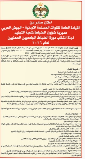 كما أعلنت القيادة العامة للقوات المسلحة الأردنية – الجيش العربي، اليوم الخميس، عن البدء باستقبال طلبات الالتحاق بدورة الضباط الجامعيين المهنيين لعام 2026 لتخصصات الطب البشري وطب الأسنان (ذكور – إناث).