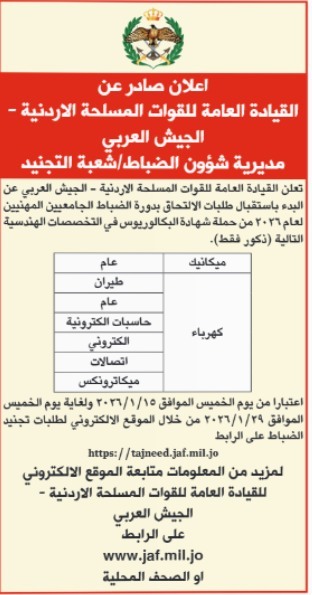 الوقائع الإخباري : أعلنت القيادة العامة للقوات المسلحة الأردنية – الجيش العربي عن البدء باستقبال طلبات الالتحاق بدورة الضباط الجامعيين المهنيين لعام 2026 من حملة شهادة البكالوريوس في التخصصات الهندسية التالية (ذكور فقط).