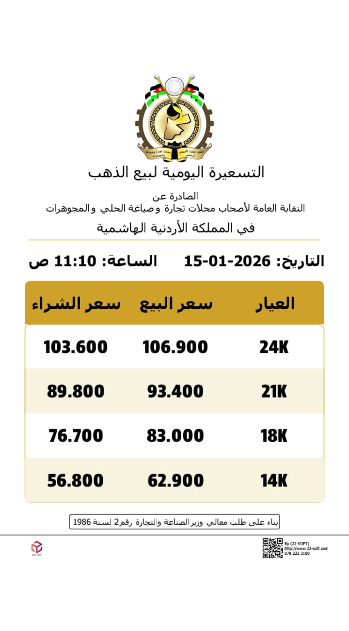 أما غرام الذهب عيار 18 فسجّل سعر بيع 83 دينارًا مقابل 76.7 دينار للشراء، في حين بلغ سعر بيع غرام الذهب عيار 14 حوالي 62.9 دينار وسعر الشراء 56.8 دينار.