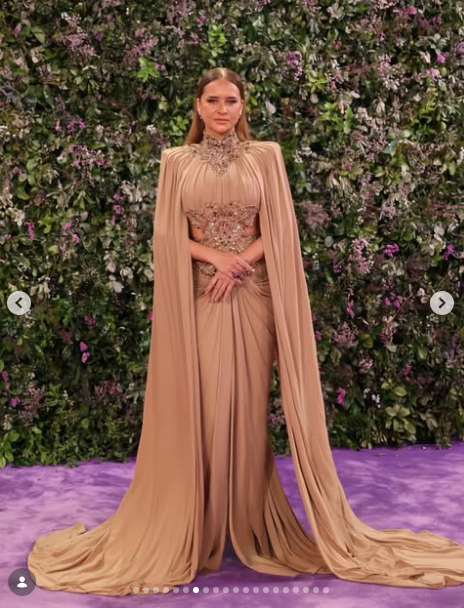 ظهرت نيللي كريم في الصور بإطلالة ملفتة، حيث ارتدت فستان طويل باللون البيج الغمق الذي حمل بعض التطريزات.