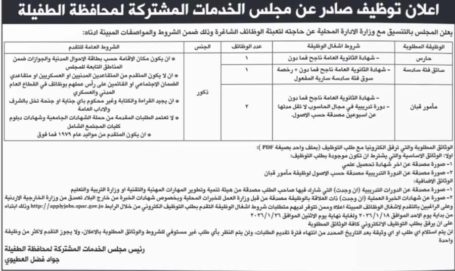 الوقائع الإخباري -اعلن مجلس الخدمات المشتركة في محافظة الطفيلة اليوم الاثنين عن حاجته لتعبئة وظائف شاغرة.