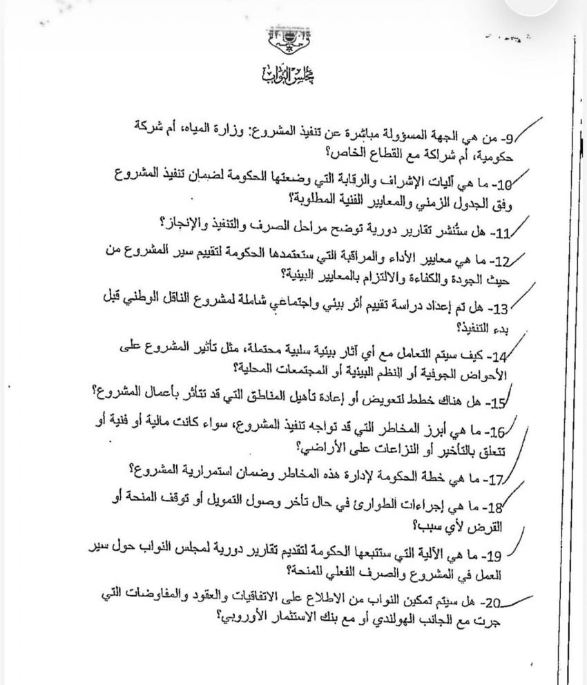 وأشارت إلى أن وزارة المياه لم تقدم إجابات وعللت ذلك بأن الملف لدى وزارة التخطيط، معتبرة أن المسؤول المباشر عن المشروع يجب أن يمتلك كامل المعلومات الفنية والمالية والتنفيذية لضمان سير المشروع دون معيقات.