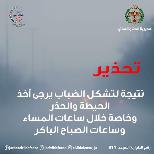 الوقائع الإخباري – حذر الدفاع المدني، عبر منشور على صفحته الرسمية، المواطنين من تدني مدى الرؤية الأفقية نتيجة تشكل الضباب، خاصة خلال ساعات المساء والصباح الباكر.