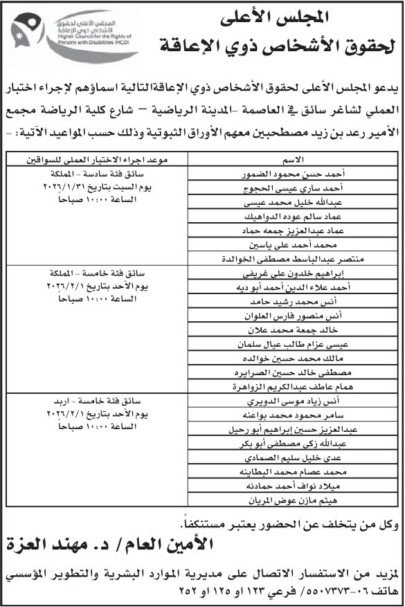 المجلس الأعلى لحقوق الأشخاص ذوي الإعاقة يعلن مواعيد الاختبار العملي